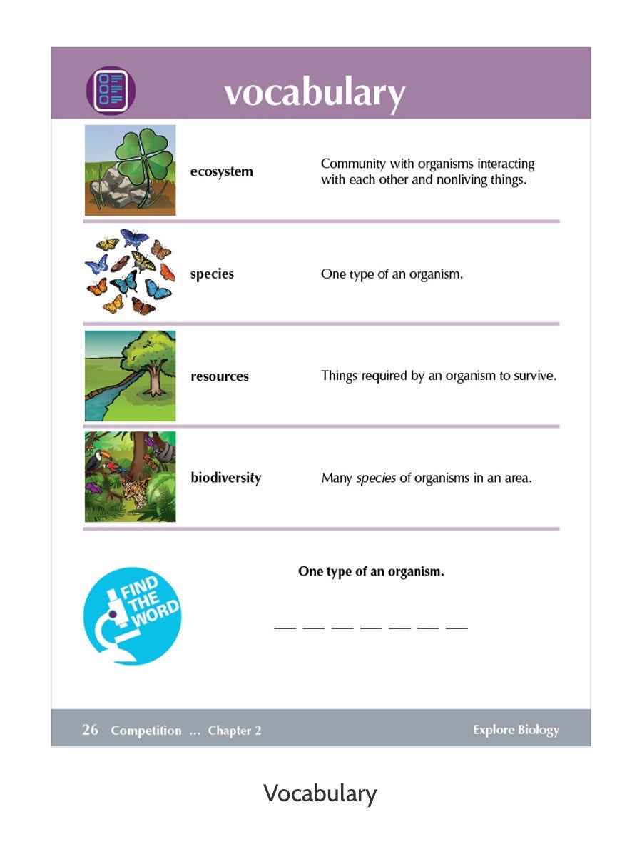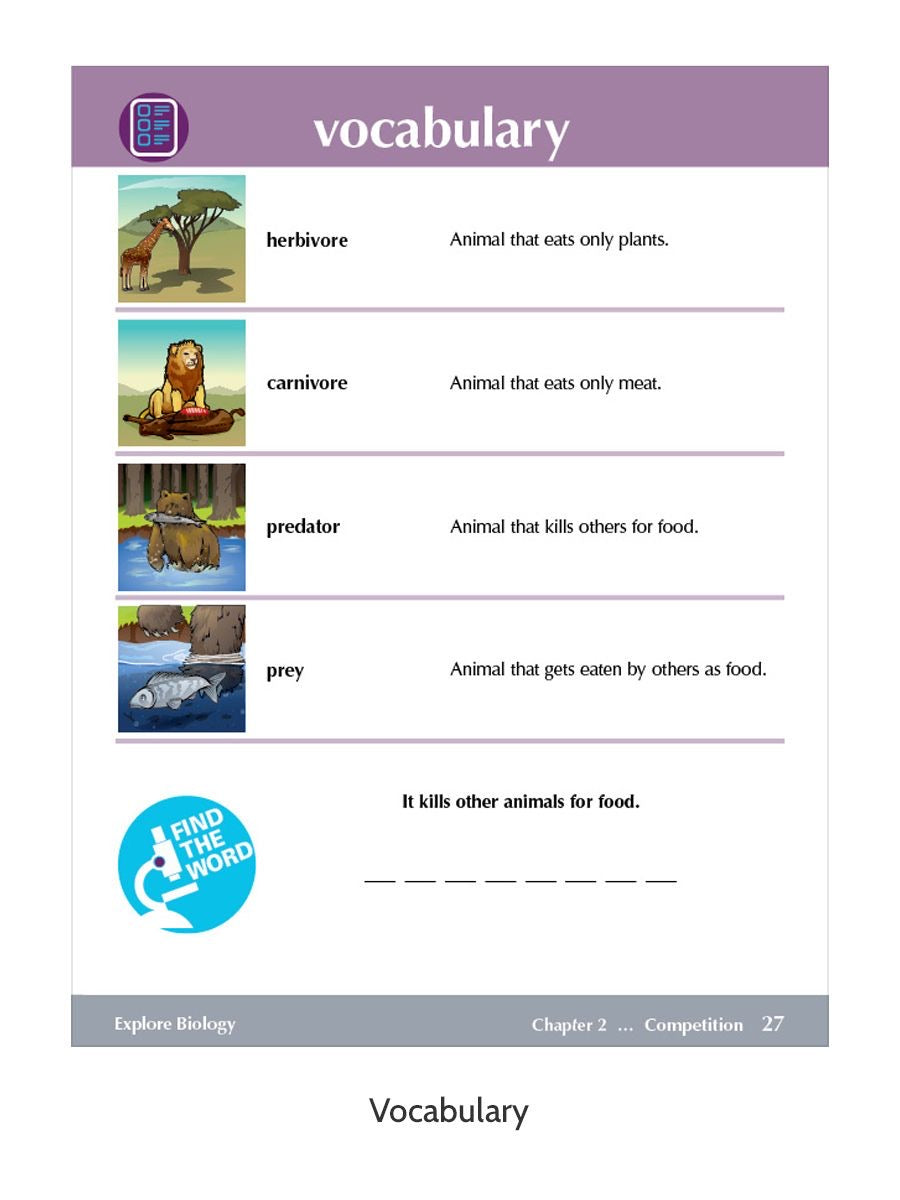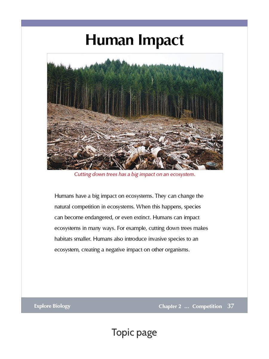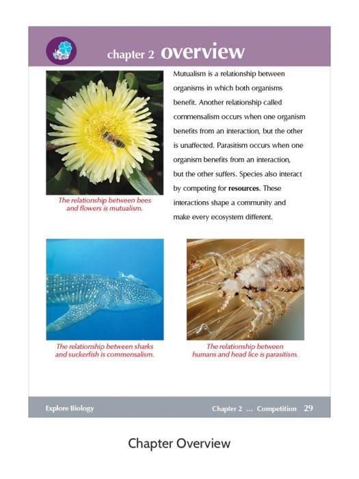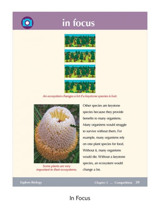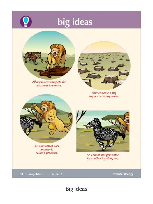 The Student Book has 11 chapters, including a supplementary chapter. The chapters cover everything from ecology to complicated cellular processes, and even genetics. The supplementary chapter is a review of Attainment’s Explore Life Science. The curriculum covers crucial biological concepts, regardless of complexity, but presents them in a way that students can grasp. Each page is heavily illustrated with about 60 words per page so it can be easily read aloud to nonreaders. All chapters follow the same template: title page, four Big Ideas, major illustration, eight vocabulary words, chapter overview, topic pages, an In Focus topic, hands-on lab lesson, and a quiz. Important concepts learned in the book are often reinforced in many places to increase student understanding.